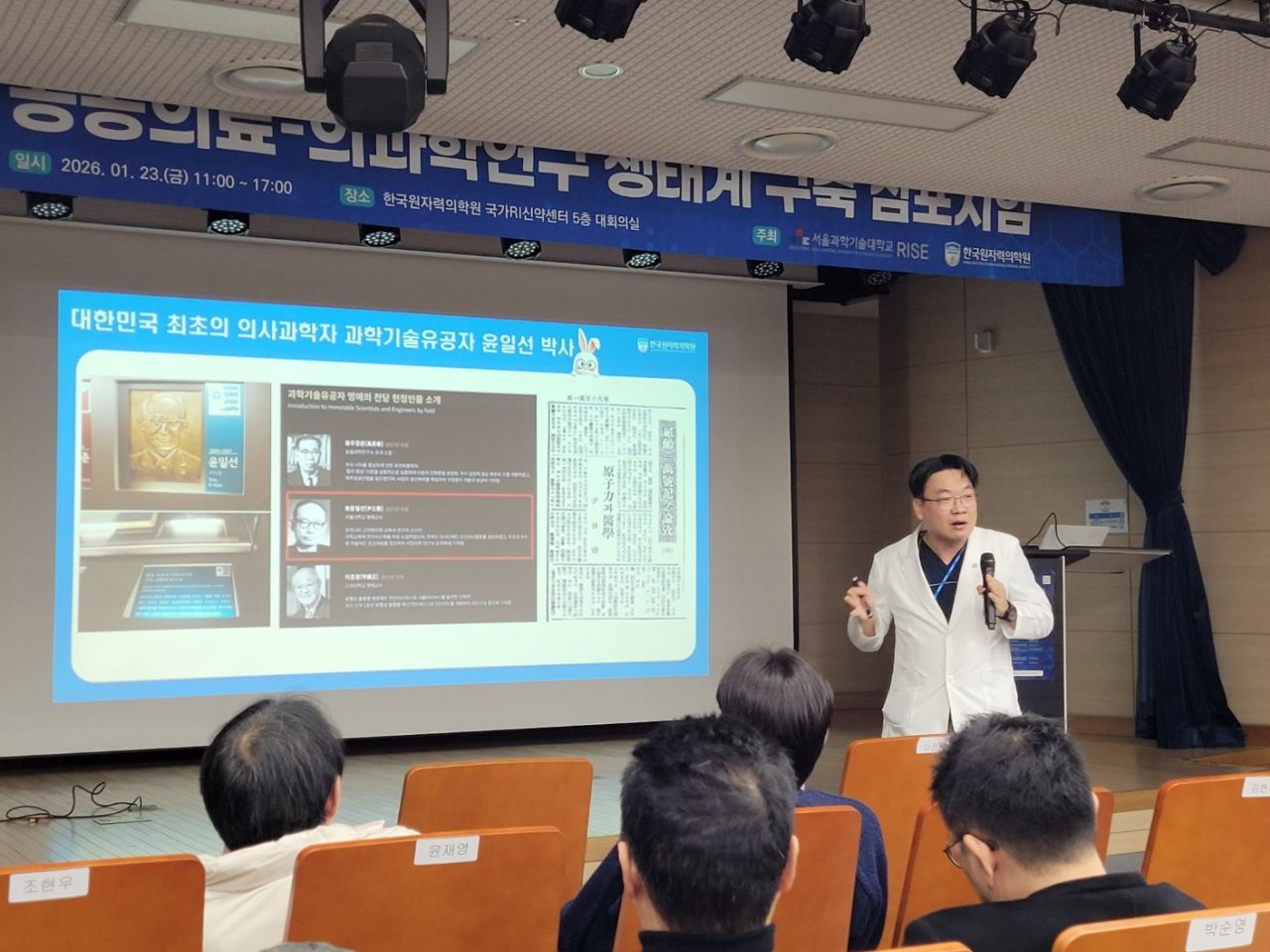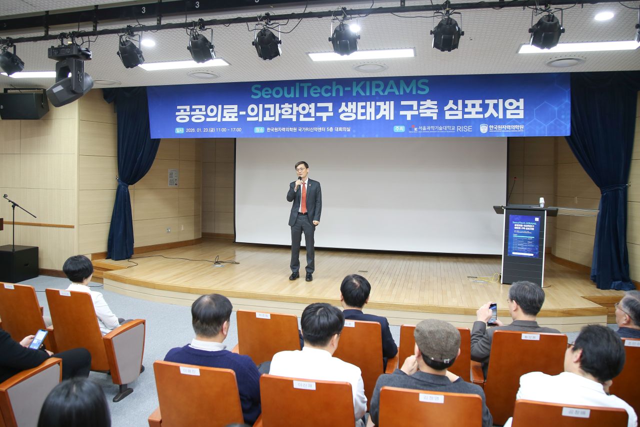 SeoulTech-KIRAMS 의과학대학원은 2026학년도 전기 신입생 오리엔테이션을 2026년 1월 23일(금) 11:00부터 17:00까지 한국원자력의학원 국가RI신약센터 5층 대강당에서 개최하였다. 이번 행사는 본교 지역혁신중심 대학지원체계 (RISE) 사업단 주관「SeoulTech-KIRAMS 공공의료–의과학연구 생태구축 심포지엄」과 함께 진행되어, 신입생과 재학생들에게 교육과 연구의 방향성을 공유하는 뜻깊은 자리로 마련되었다. 이날 행사에는 서울과학기술대학교 김동환 총장과 한국원자력의학원 이진경 원장을 비롯해 양 기관 관계자, 의과학대학원생 등 약 70여 명이 참석하였다.